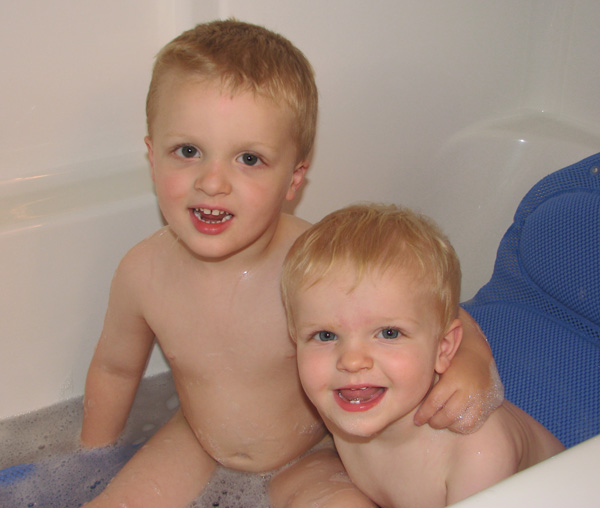 was over. Connor and Beckett really like baths and complain when its time to get out. Here they are at our place working off the trail dust. |