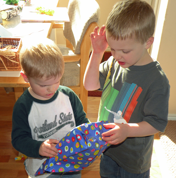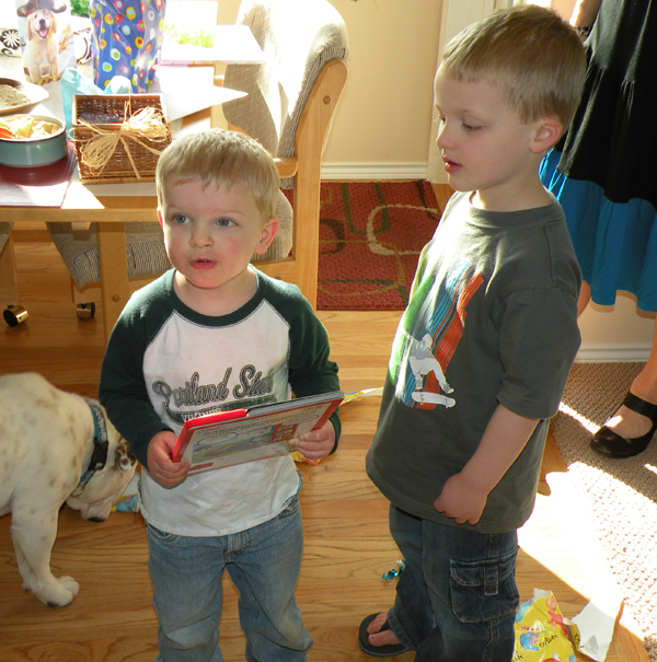 Beck examines gift as Gus examines wrapping. ![]() Li and the boys.